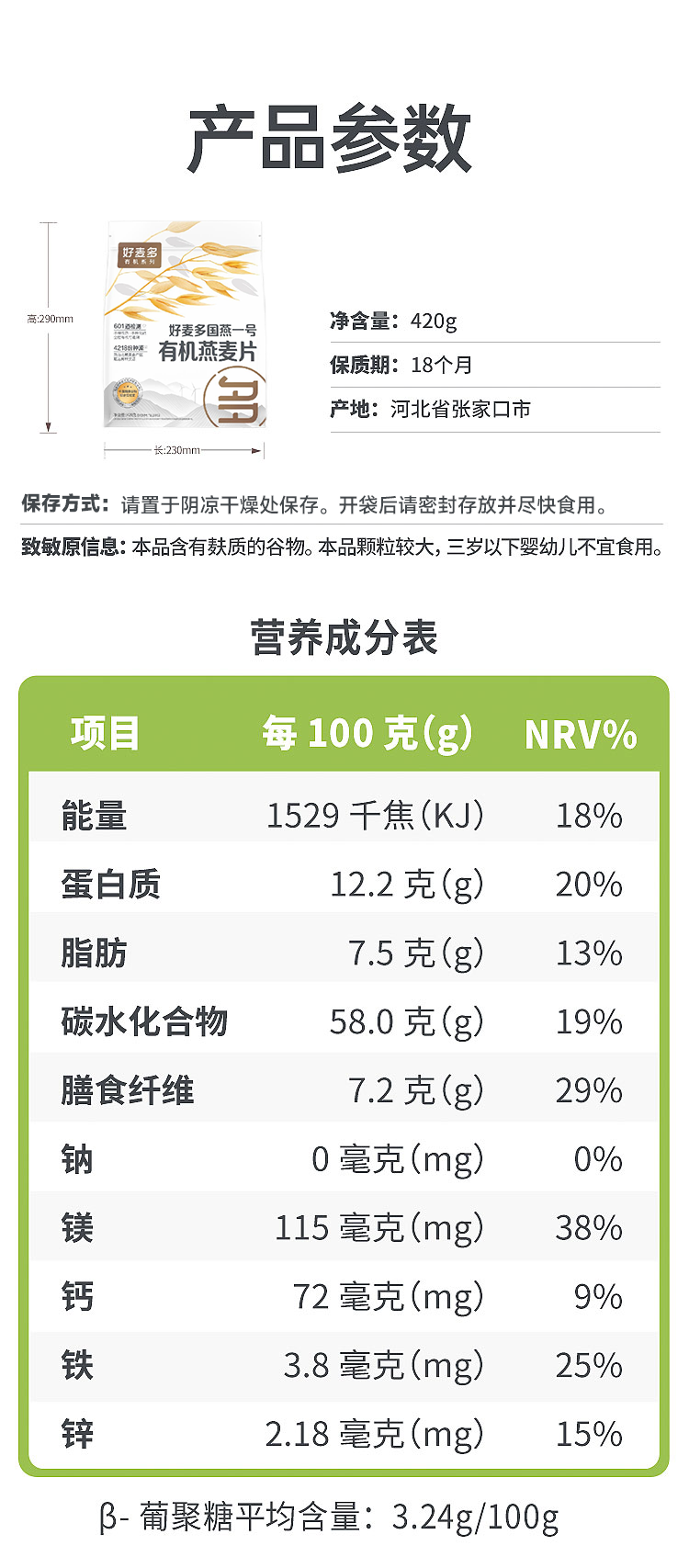 好麦多(HONlife) 有机燕麦片 420g 营养速食谷物早餐 白色(单位:袋)