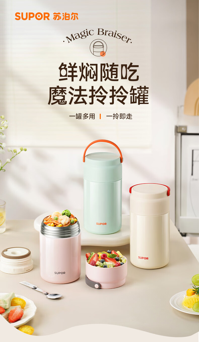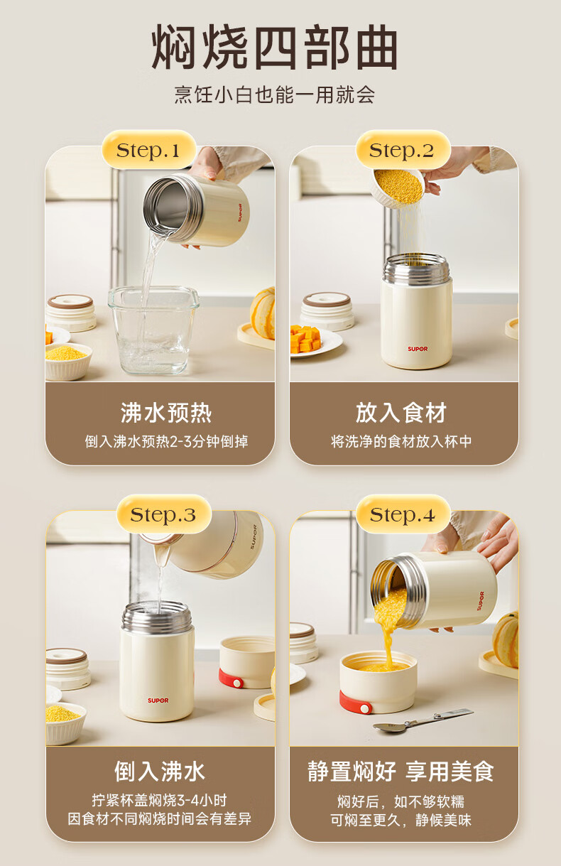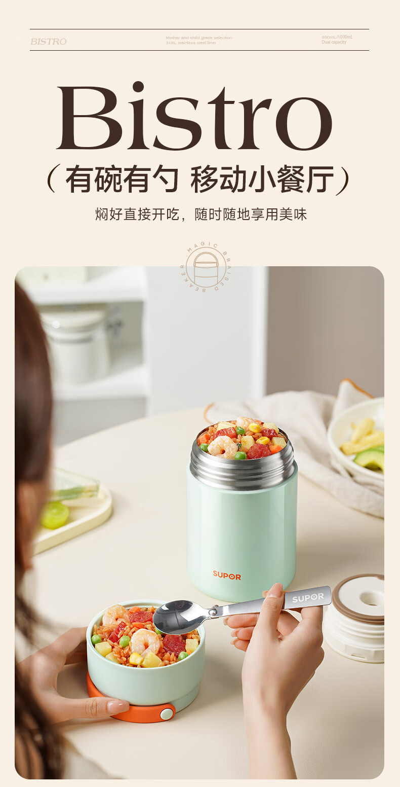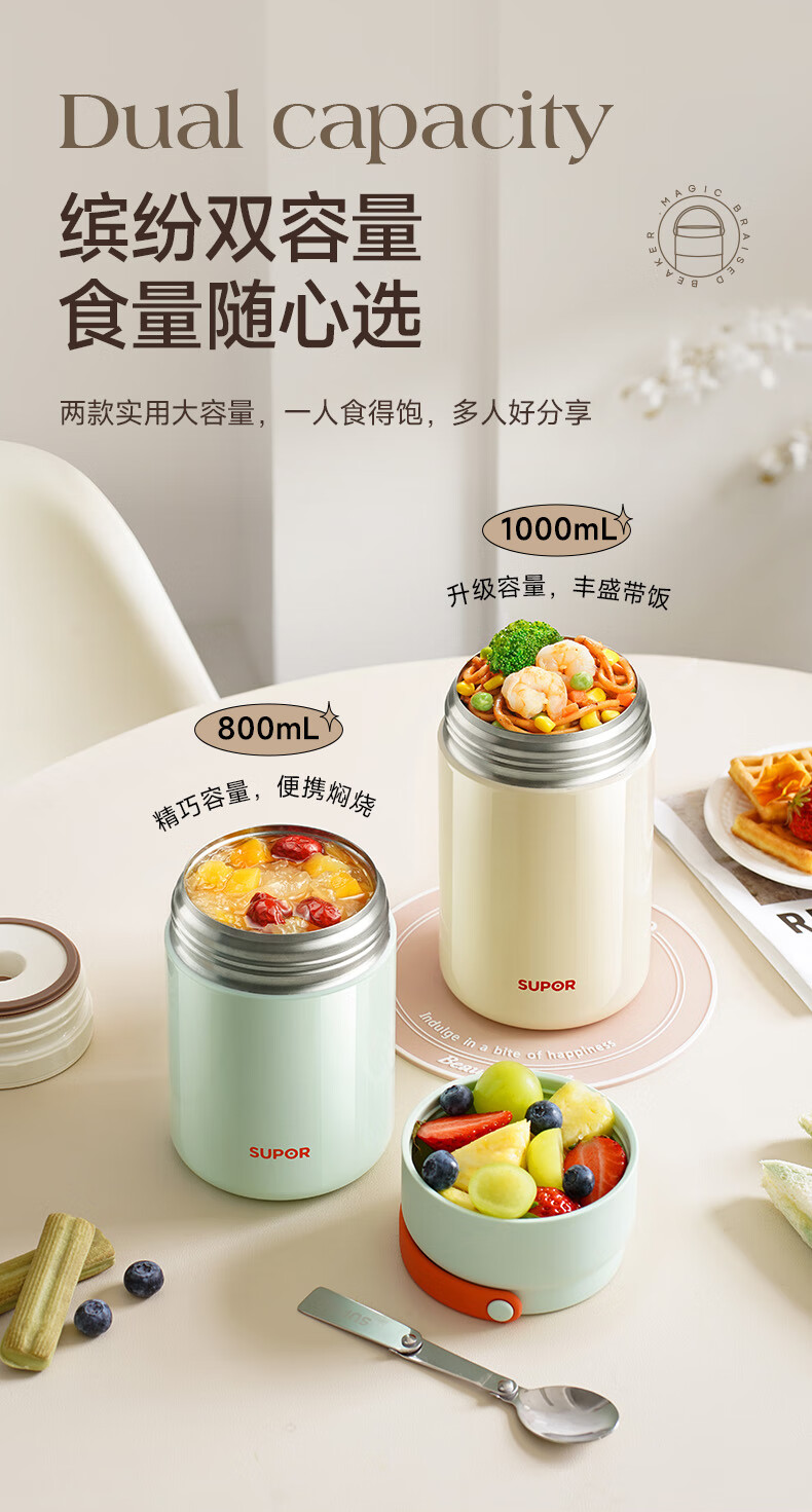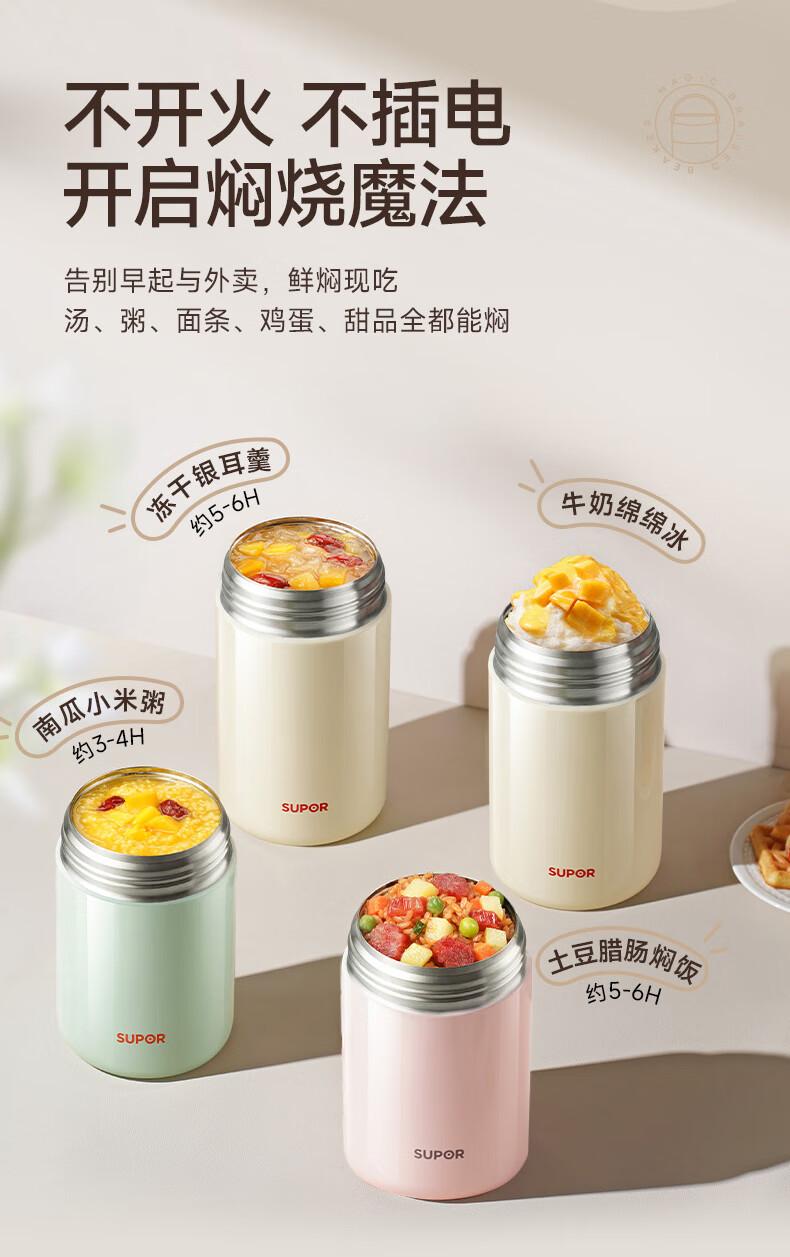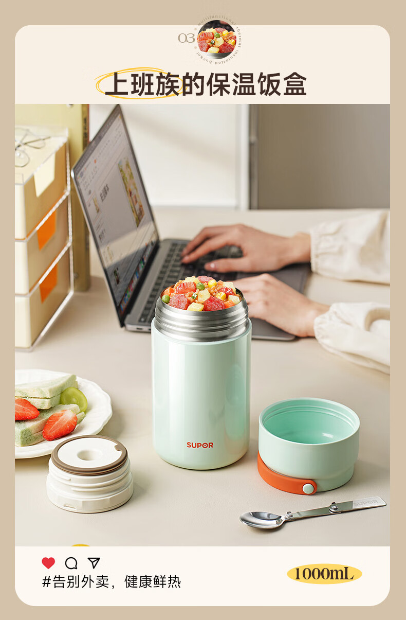 苏泊尔(SUPOR) 焖烧杯316L不锈钢焖烧壶保温饭盒带饭焖粥真空闷烧壶罐1000ml白