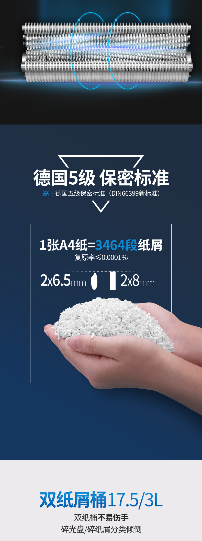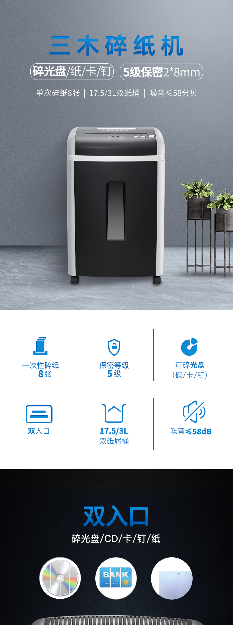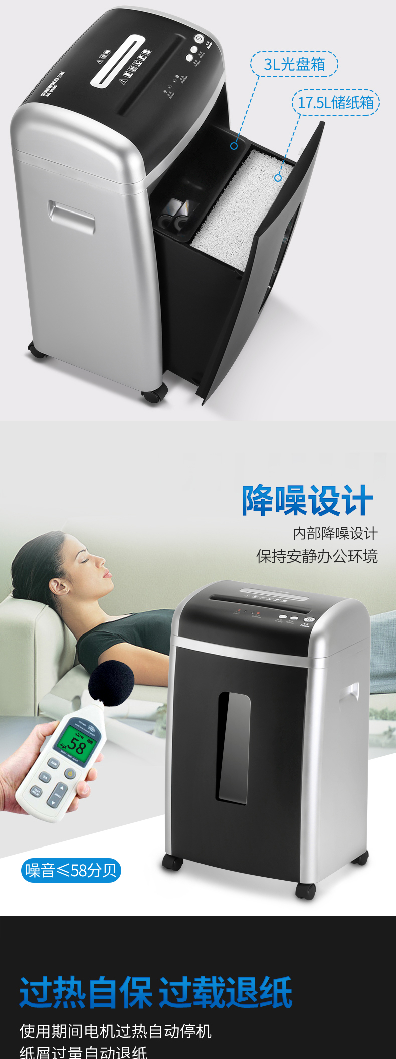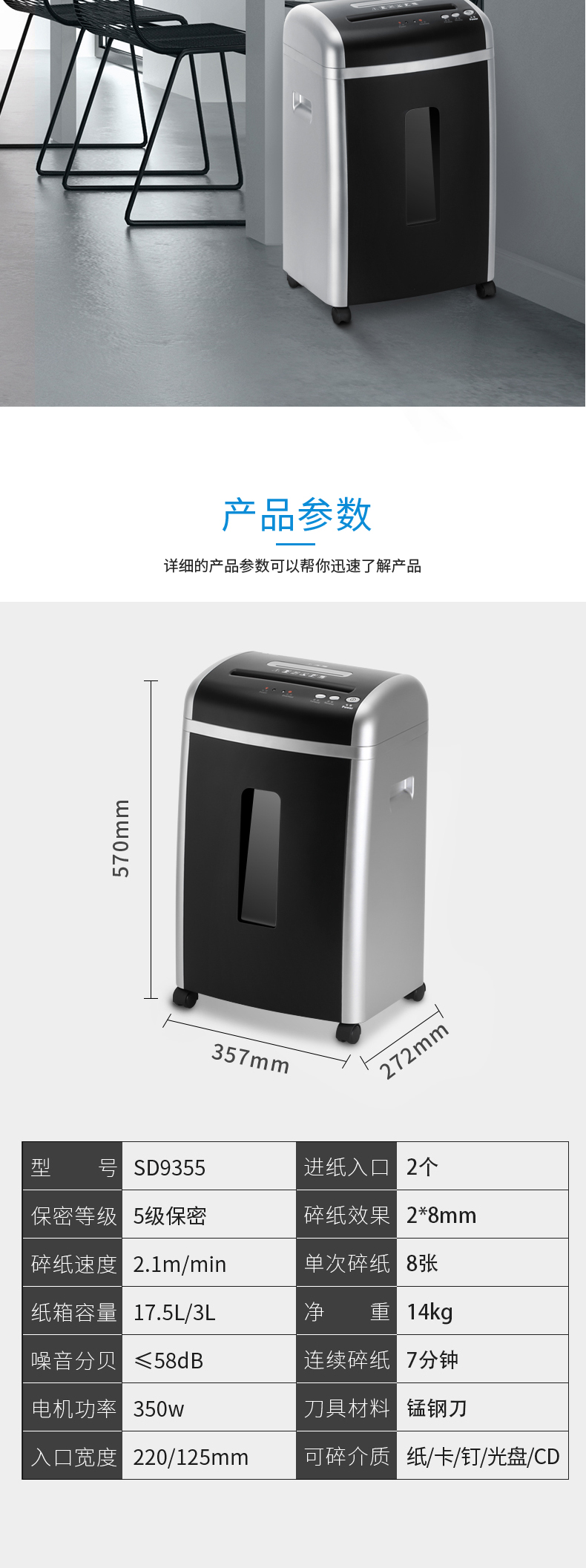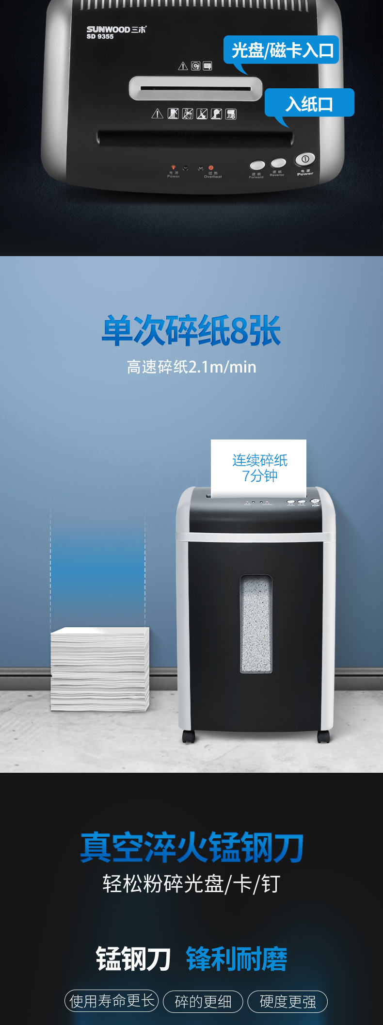 三木(SUNWOOD)5级保密办公商用碎纸机 (单次8张 持续7分钟 17.5L 可碎纸,光盘,卡,回形针、订书针) SD9355