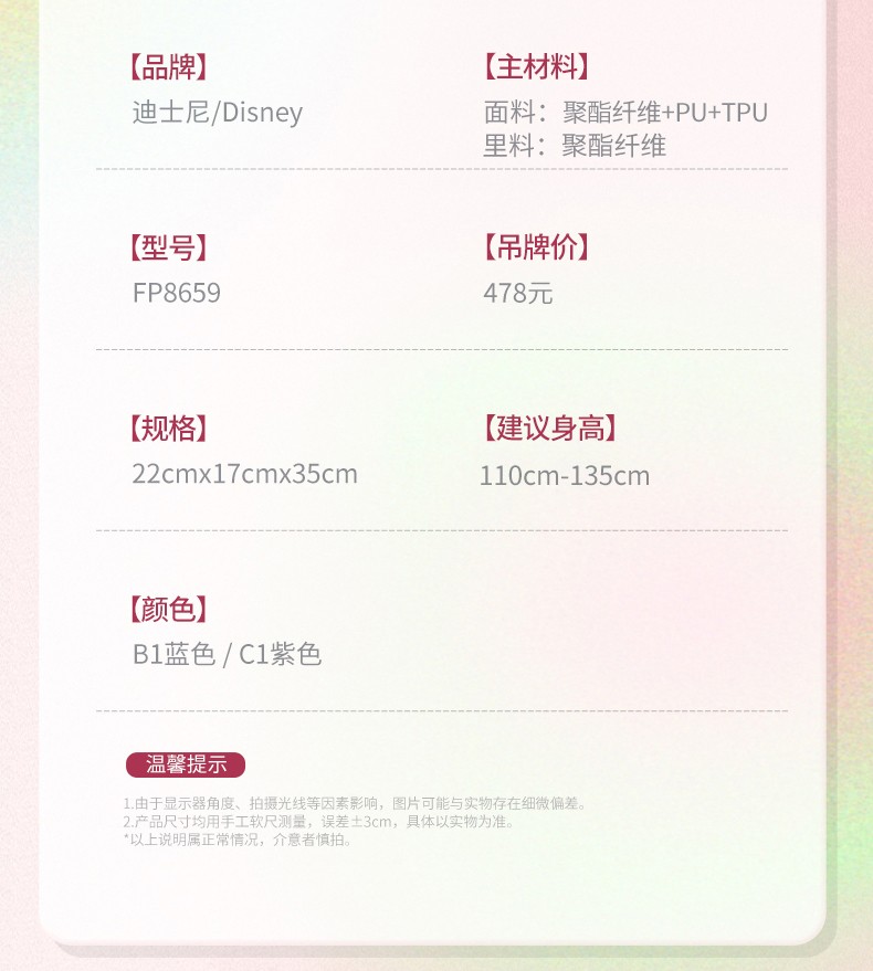 迪士尼(Disney) FP8659B1 0.75kg 小学生1-3年级书包 蓝色(单位:个)