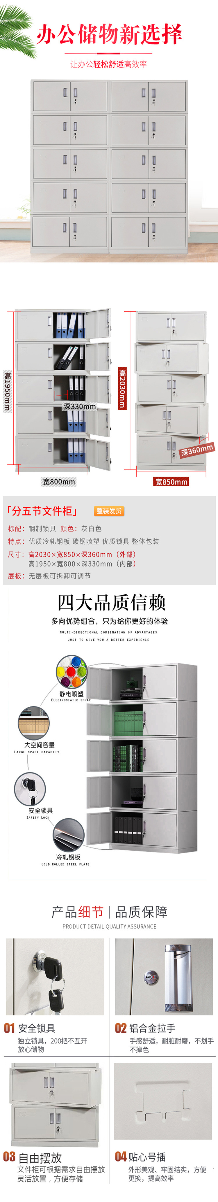 企诺 办公室铁皮文件柜分体五节柜 QNGa09A1-04PA 850*360*2030mm|0.35mm 灰白色(单位:个)