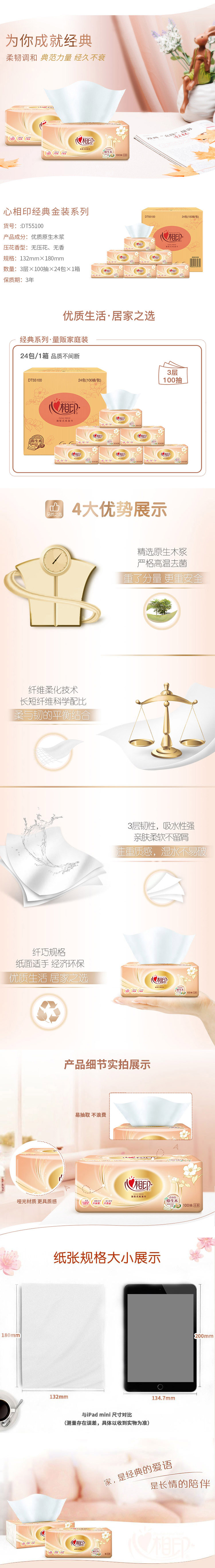 心相印(Mind Act Upon Mind)抽纸餐巾纸金装经典系列 DT55100 3层100抽24包 (单位:箱) 白色