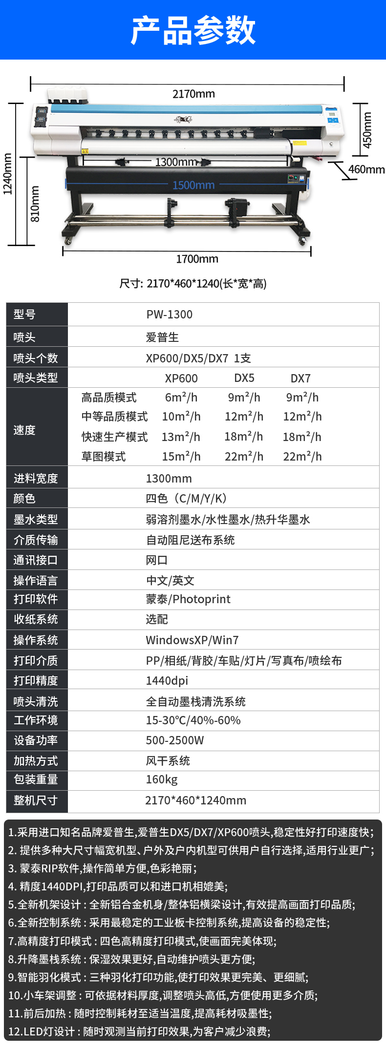 普伟国产大幅面写真喷绘机绘图仪1.3米户内/户外广告打印商用海报卷材热转印xp600单喷头经济版打印机PW-1306 白色