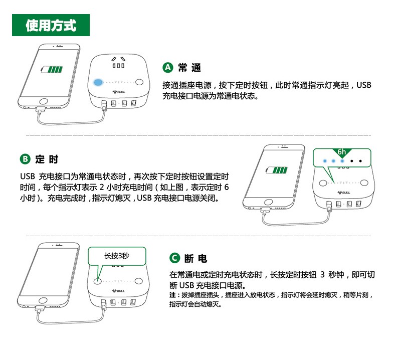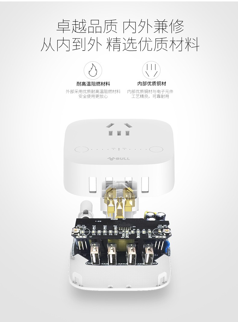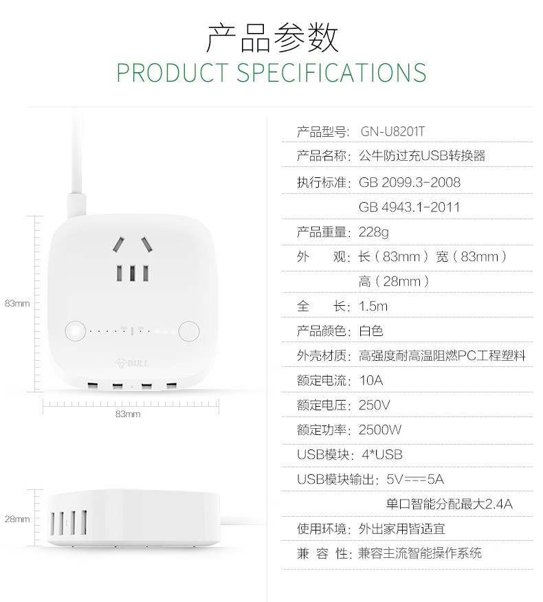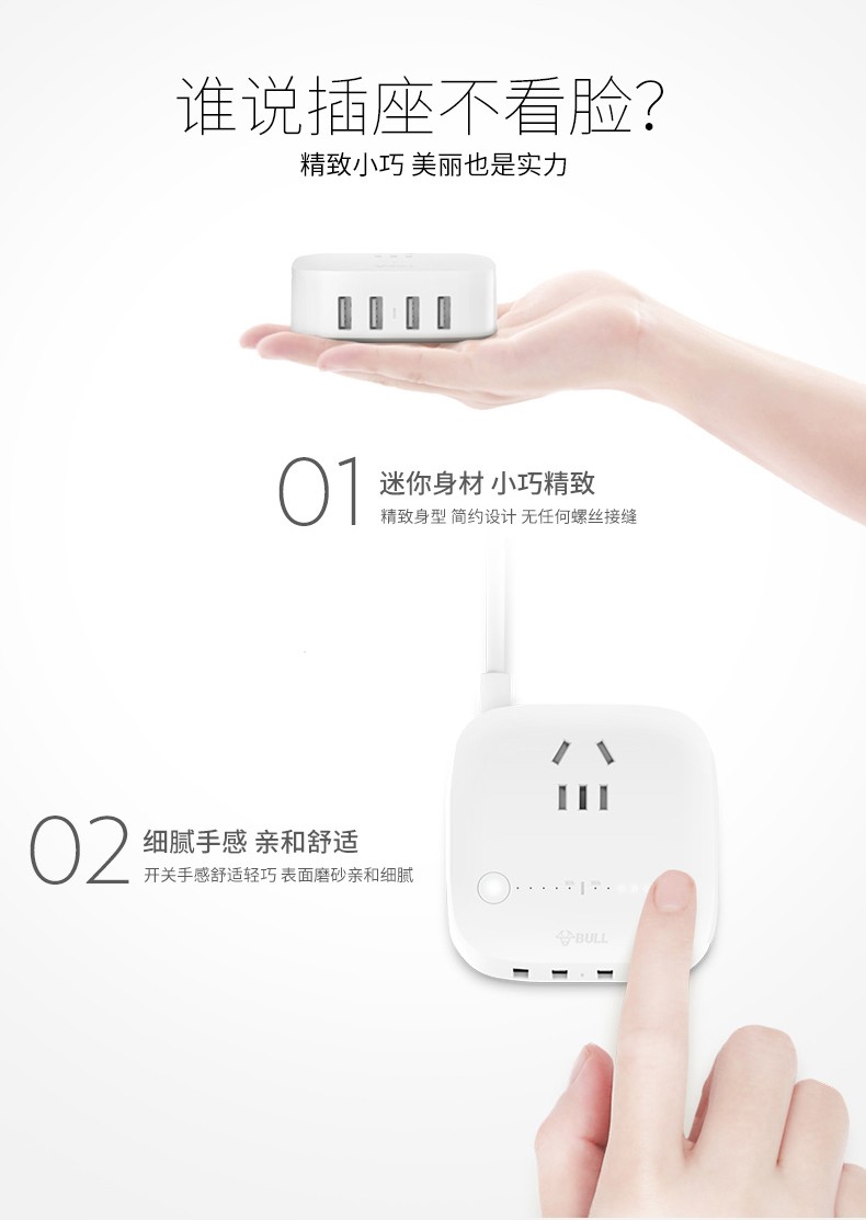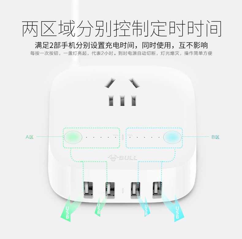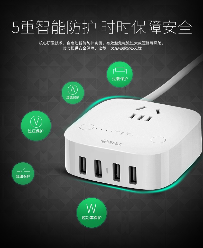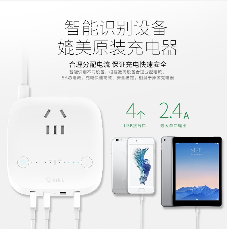 公牛 USB插座 手机充电器 多功能插座防过充快充 多口手机充电头苹果/华为/小米手机平板插座插排 GN-U8201T 自动防过冲USB充电盒 白色