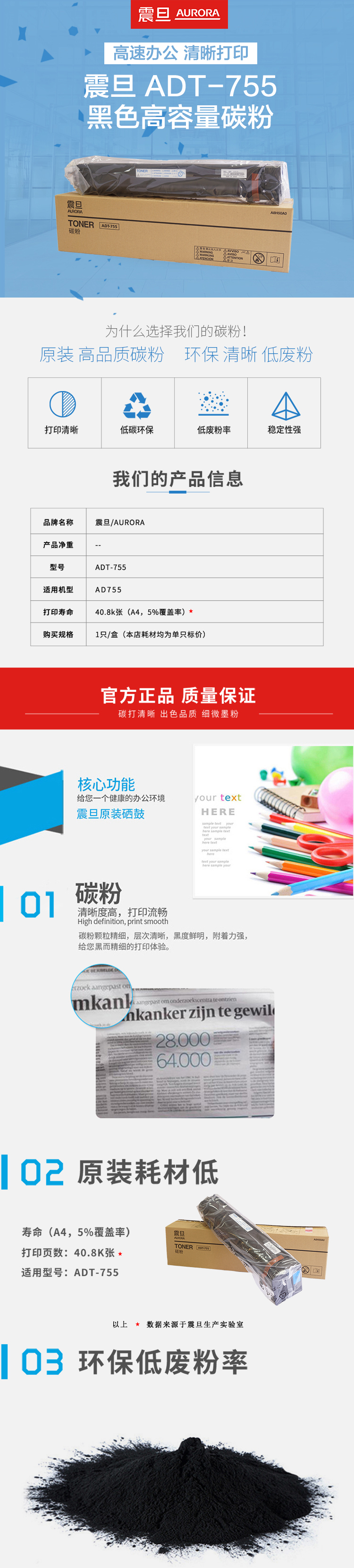 震旦(AURORA)ADT-755黑色高容量碳粉(适用AD755机器)约4万页 黑色