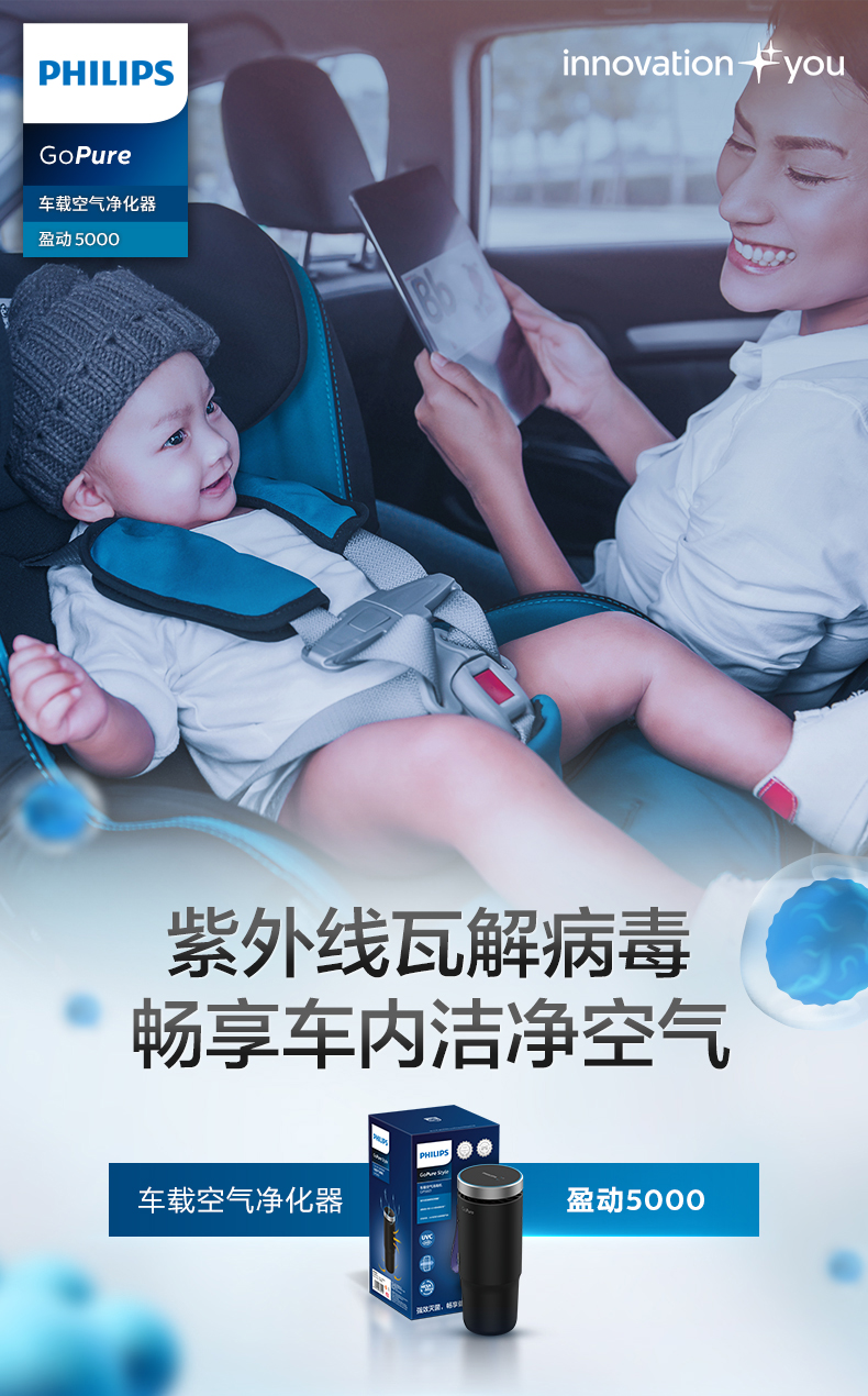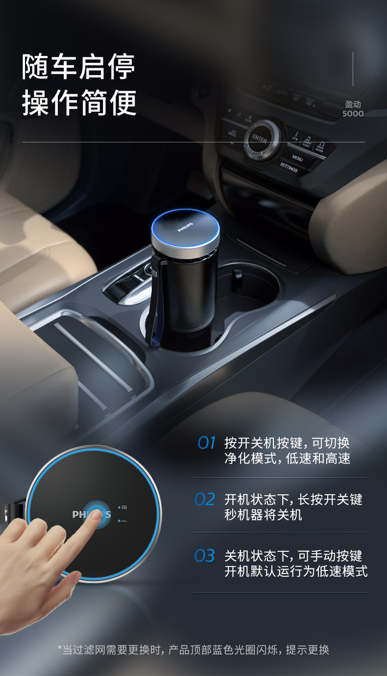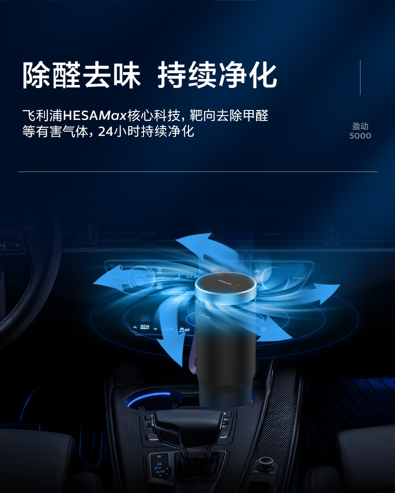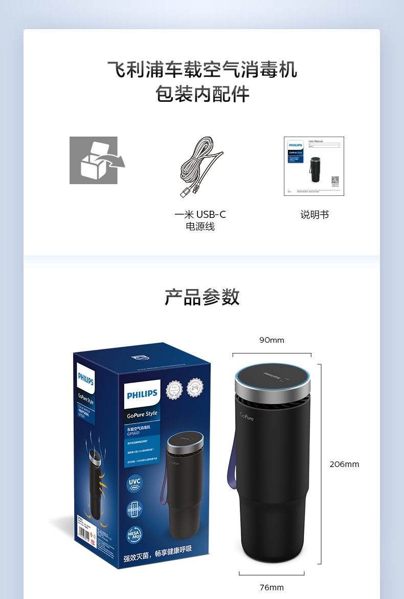 飞利浦(PHILIPS)车载空气净化器 HEPA/HESA 汽车空气净化器 新车过滤细菌UVC瓦解病毒危害GP5601 黑色