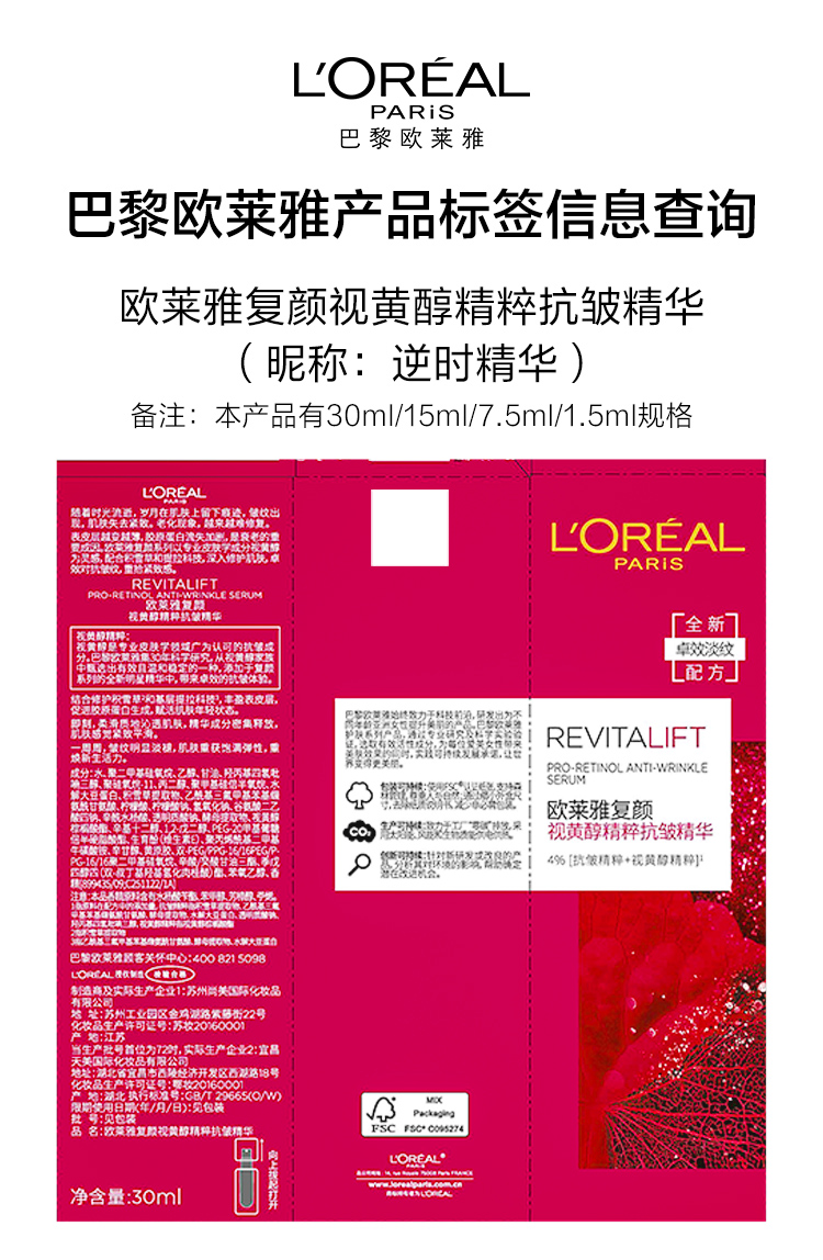 欧莱雅(LOREAL ) 逆时精华 【紧致抗皱】 30ml 补水保湿抗皱紧致 银色(单位:瓶)