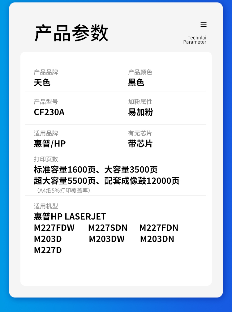 天色 CF230A 芯片版 1600页 适用惠普M203dw 硒鼓 1.00 只/支 (计价单位:支) 黑色