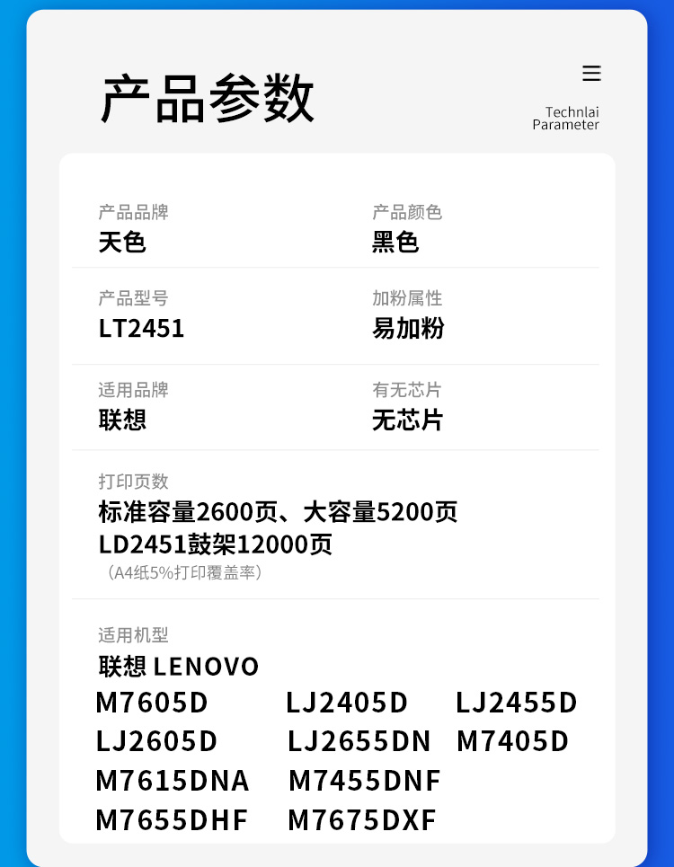 天色 LT2451 标准版易加粉 打印量2600页 适用于联想LJ2605D等 粉盒 1.00 只/个 (计价单位:个) 黑色