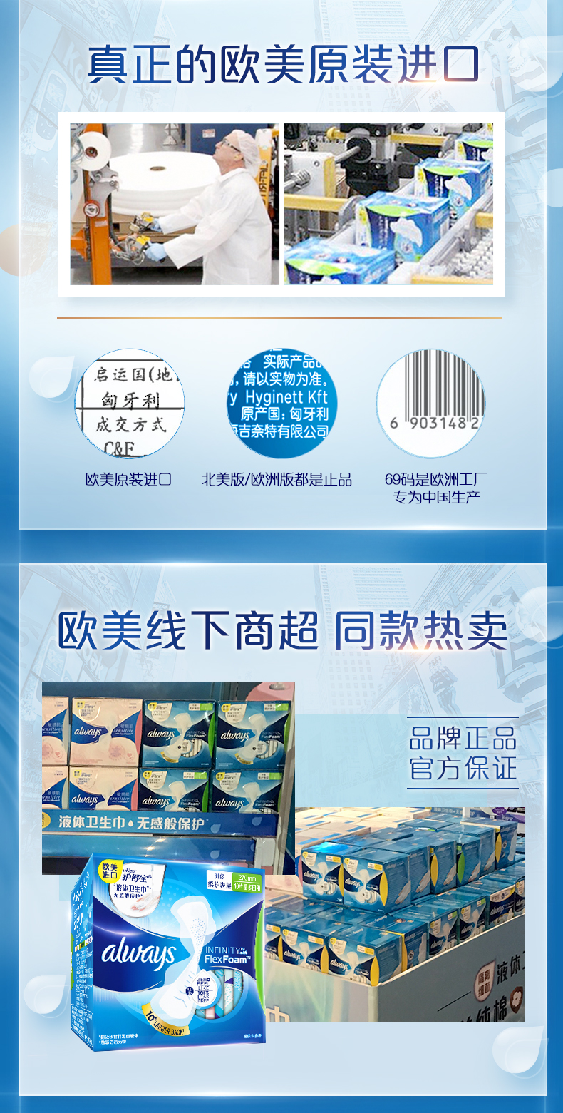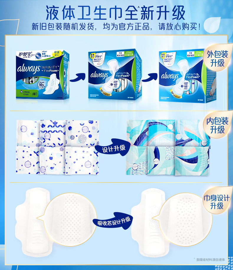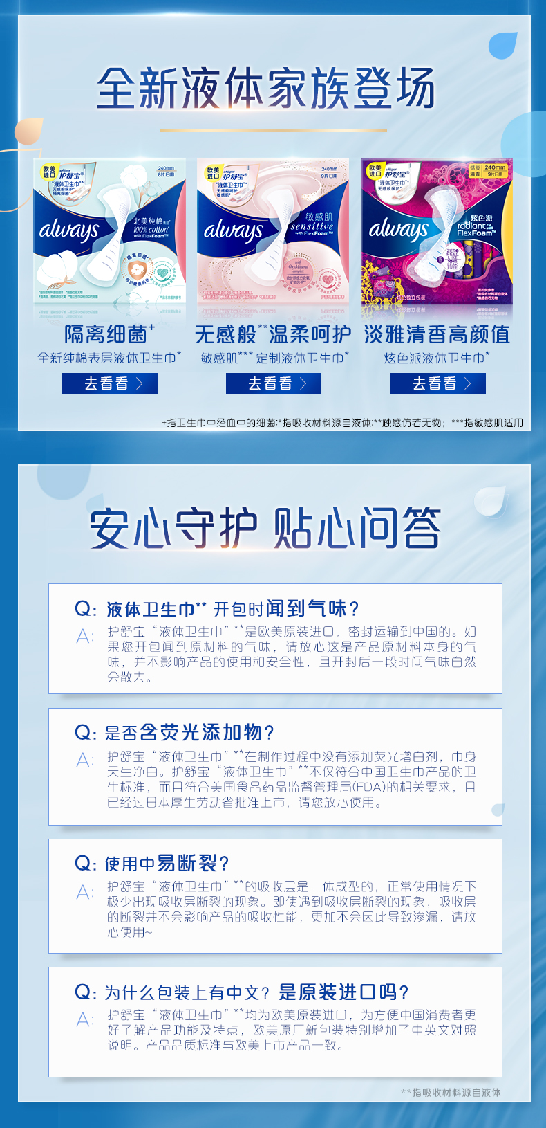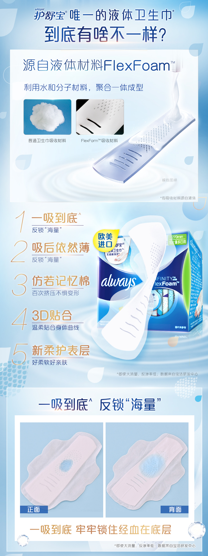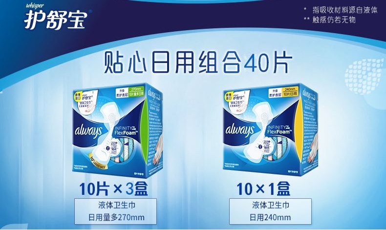 护舒宝液体卫生巾进口always超薄日用240mm女姨妈巾10片加夜用270mm30片 深蓝色