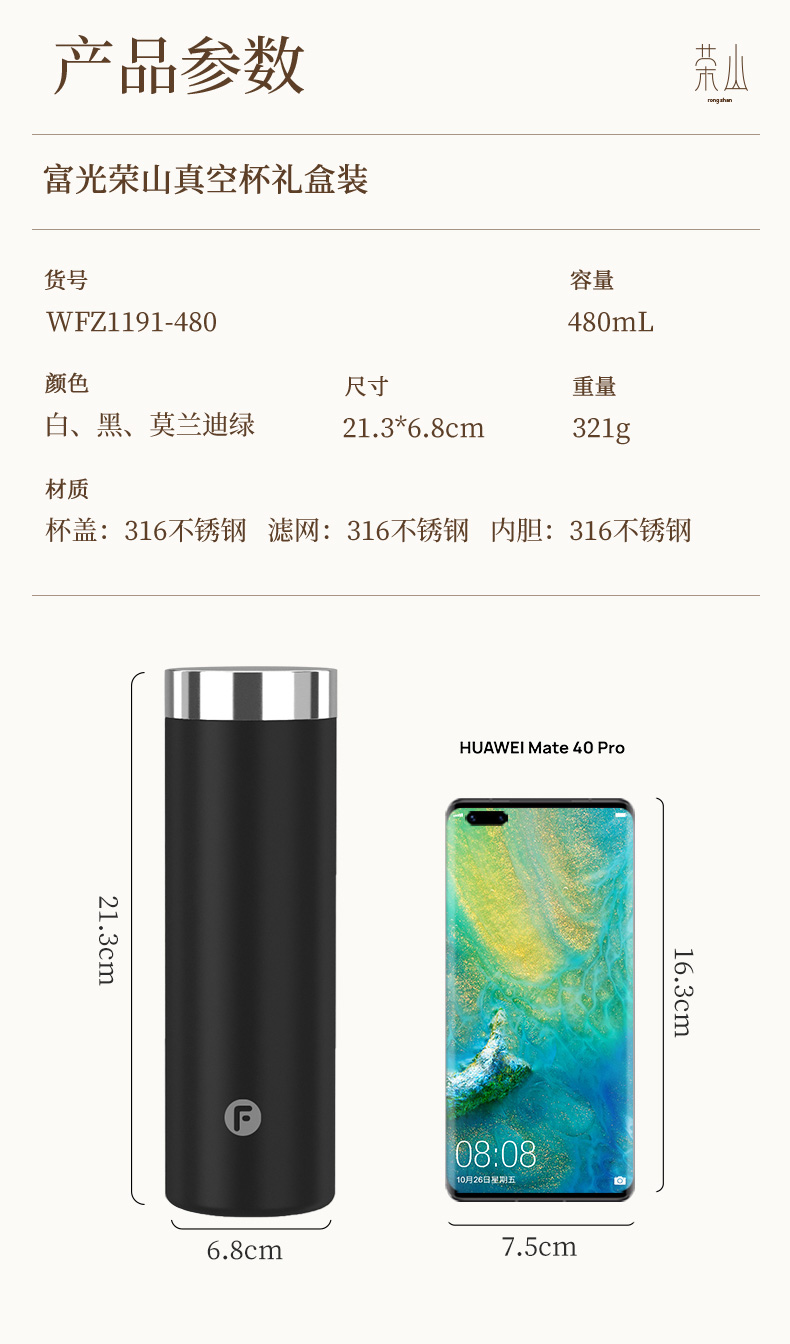 富光480ml荣山真空保温杯WFZ1213-480(单位:只) 雾雨绿