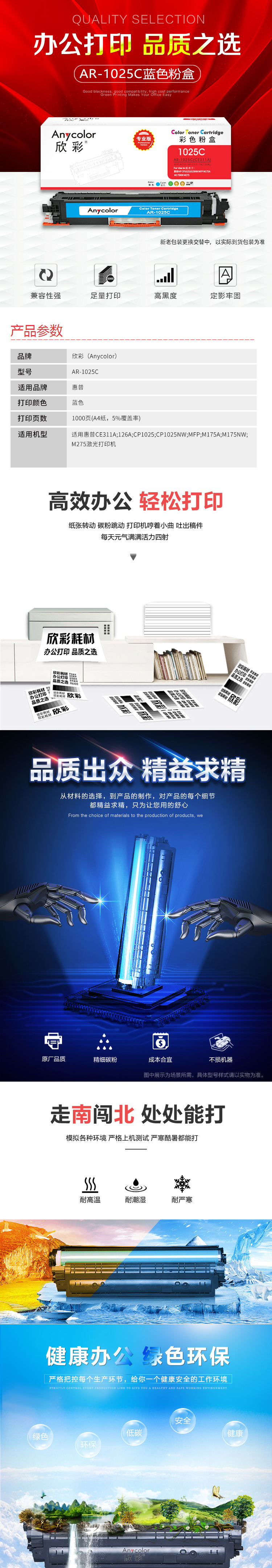 欣彩AR-1025C粉盒蓝色专业版 适用惠普CE311A 126A CP1025 CP1025NW MFP M175A M175NW 单位:支 起订量1支 蓝色