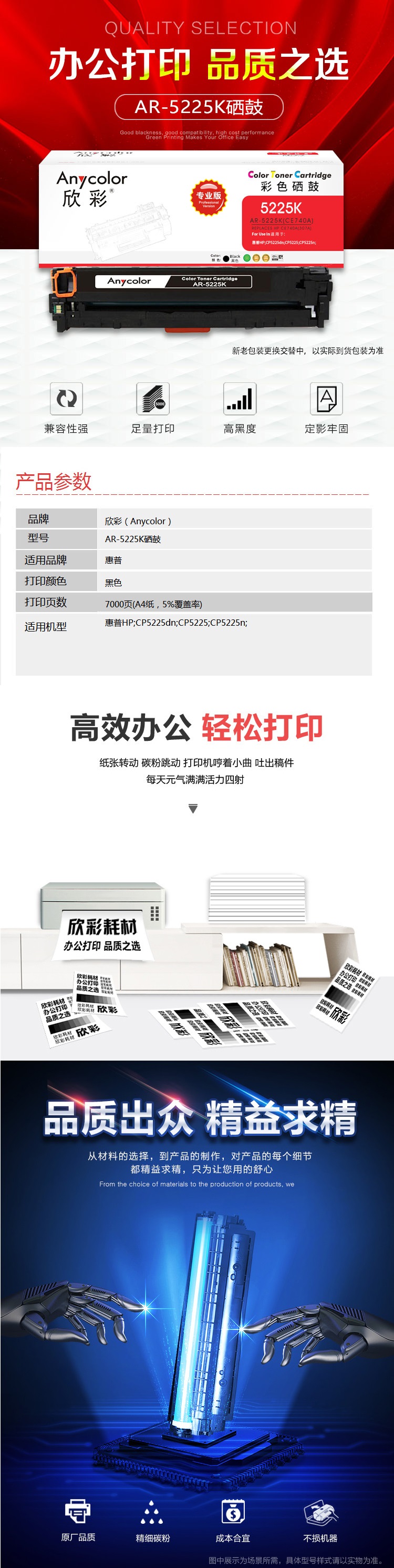 欣彩AR-5225K黑色硒鼓 专业版 适用惠普HP CE740A 307A CP5220 CP5225 CP5225N CP5225DN激光打印机 黑色