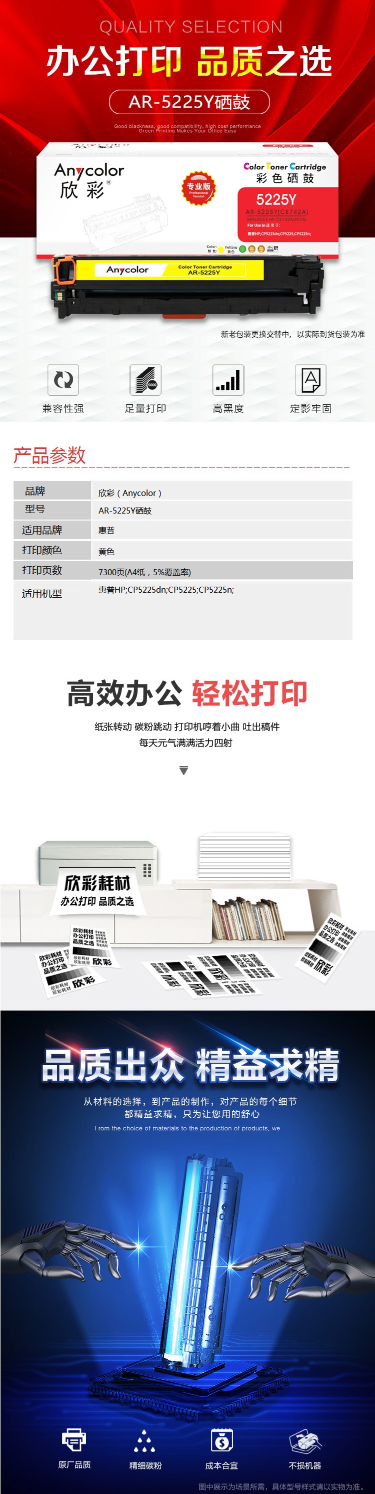 欣彩AR-5225Y黄色硒鼓 专业版 适用惠普HP CE742A 307A CP5220 CP5225 CP5225N CP5225DN激光打印机 黄色