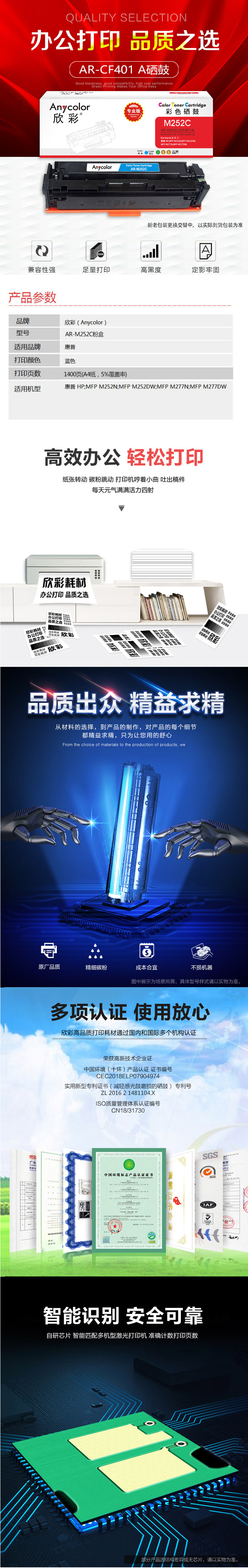 欣彩AR-M252C硒鼓蓝色专业版2.3K 适用惠普CF401A 201A M252n M252dn M252dw M277dw 单位:支 起订量1支 蓝色