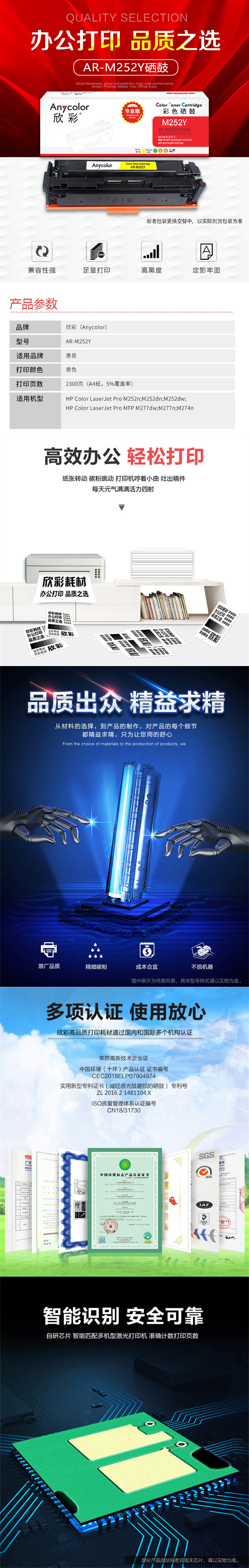 欣彩AR-M252Y硒鼓黄色专业版2.3K 适用惠普CF402A 201A M252n M252dn M252dw M277dw 单位:支 起订量1支 黄色