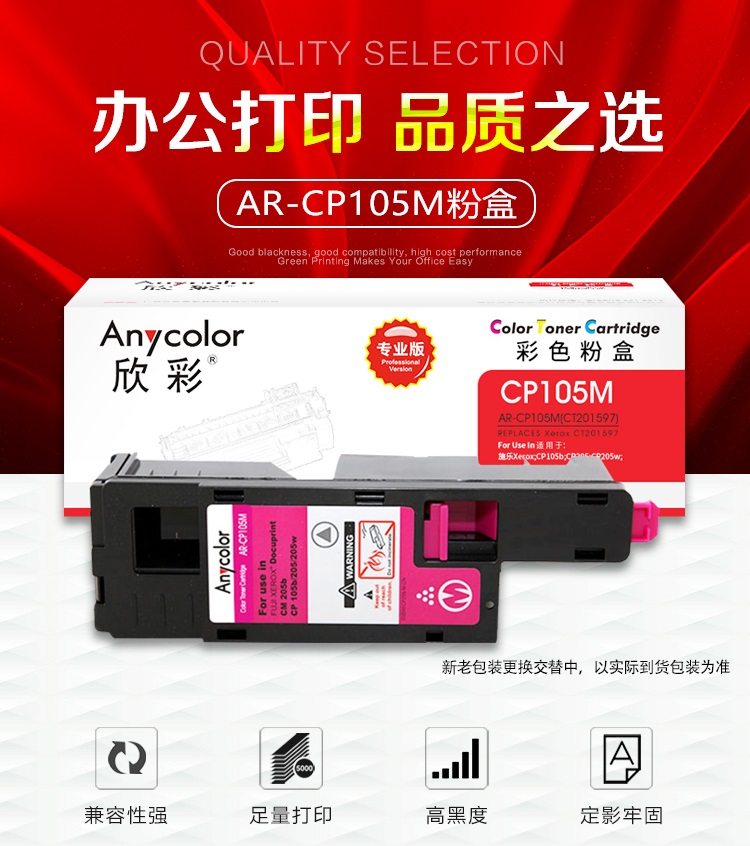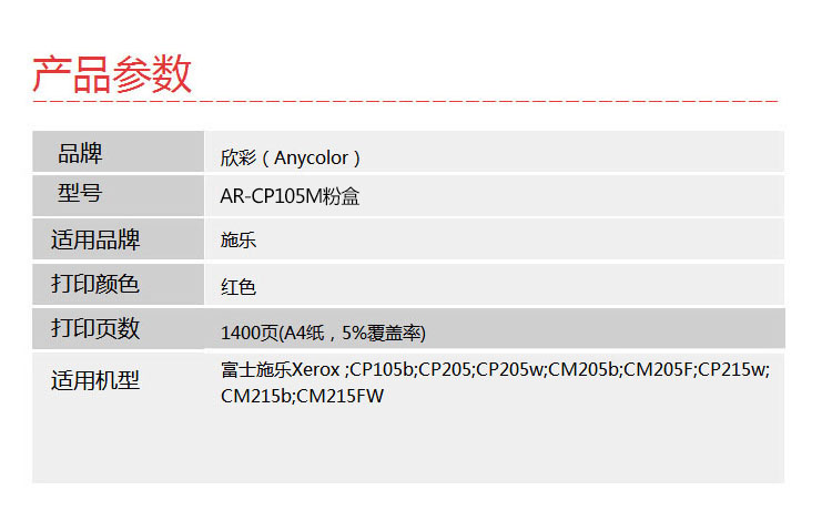 欣彩(Anycolor) AR-CP105M 1400页 适用施乐CP105b 205b 粉盒 1.00 只/支 (计价单位:支) 红色