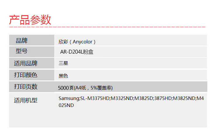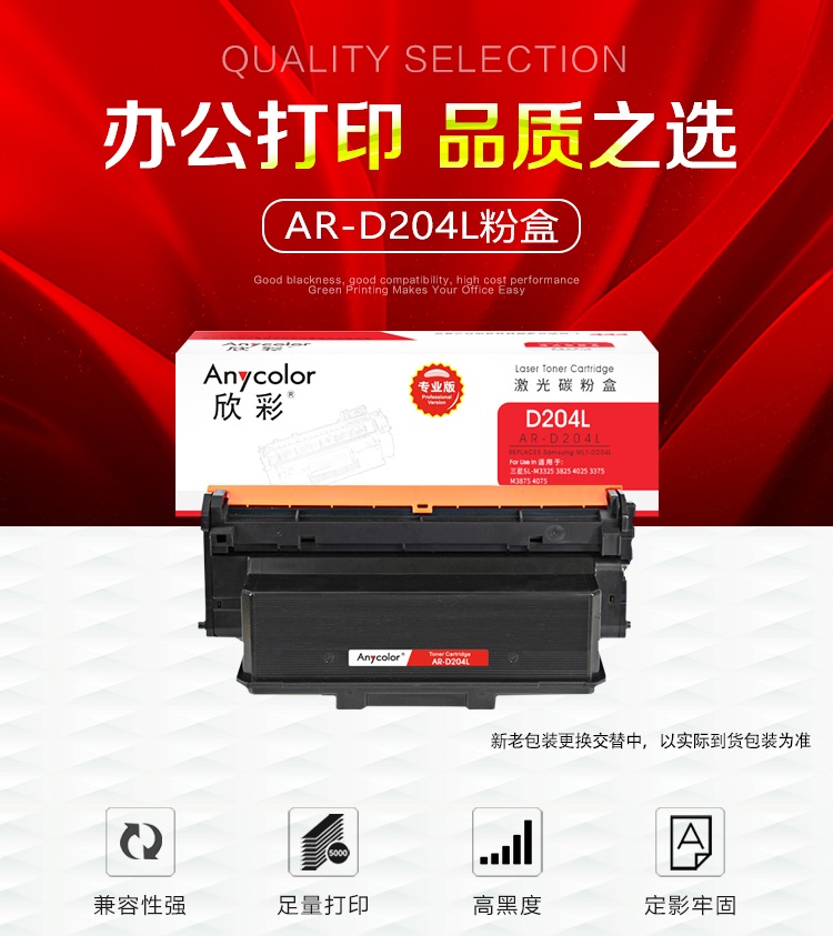 欣彩 AR-D204L粉盒专业版 适用三星MLT-D204L SL-M3325ND M3825D M4025ND M3375HD 单位:支 起订量1支 黑色