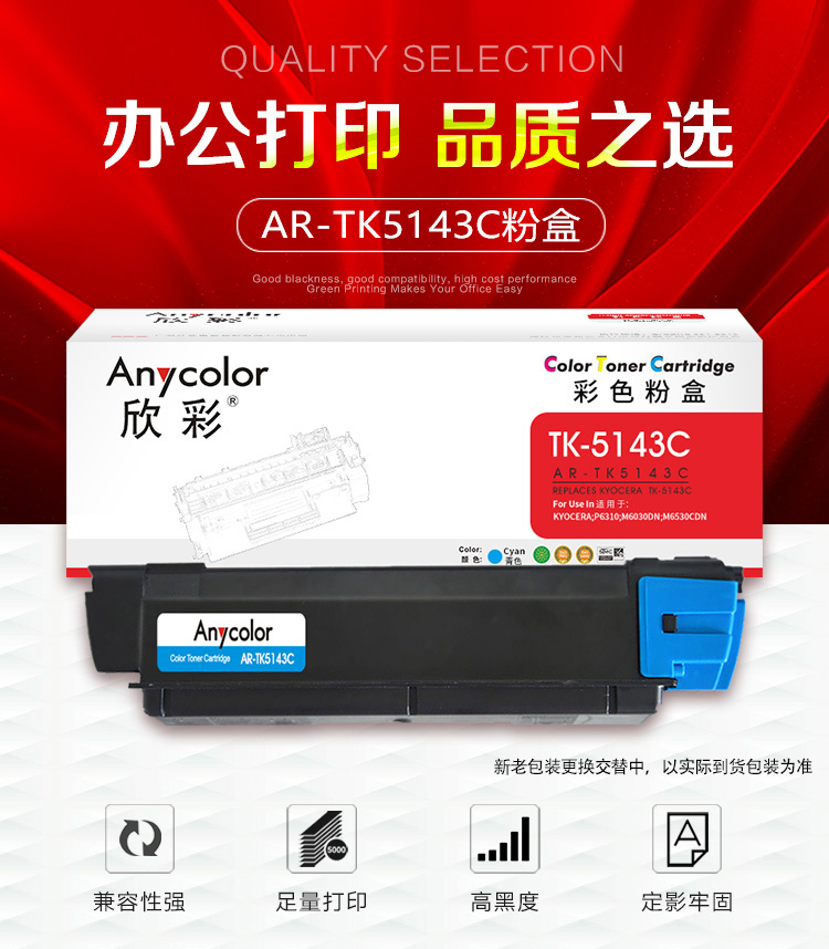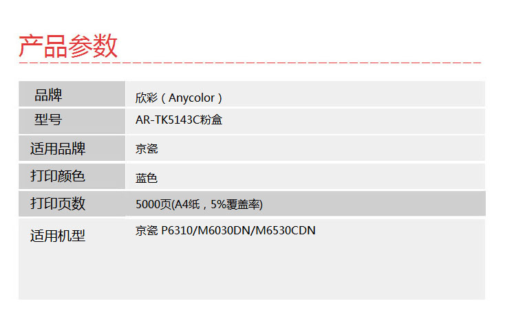 欣彩(Anycolor) AR-TK5143C 5000页 适用京瓷KYOCERA P6310 粉盒 1.00 只/支 (计价单位:支) 蓝色