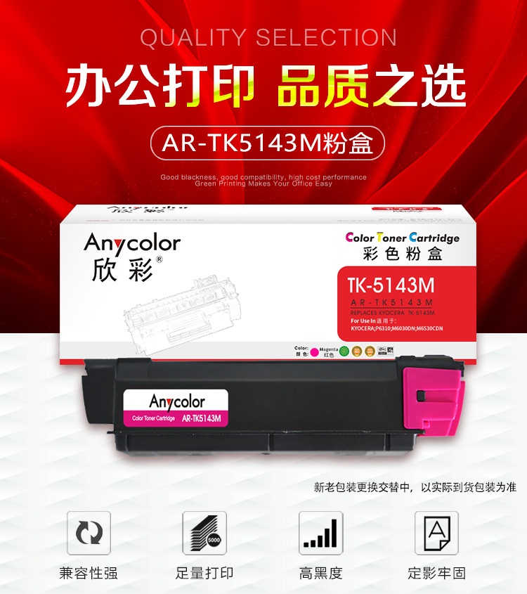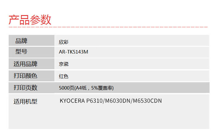 欣彩 AR-TK5143M红色粉盒 专业版 适用京瓷KYOCERA TK-5143 P6310 M6030DN M6530CDN 1支 红色