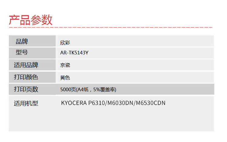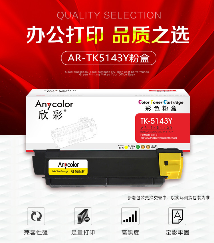 欣彩(Anycolor) AR-TK5143Y 5000页 适用京瓷KYOCERA P6310 粉盒 1.00 只/支 (计价单位:支) 黄色 黄色