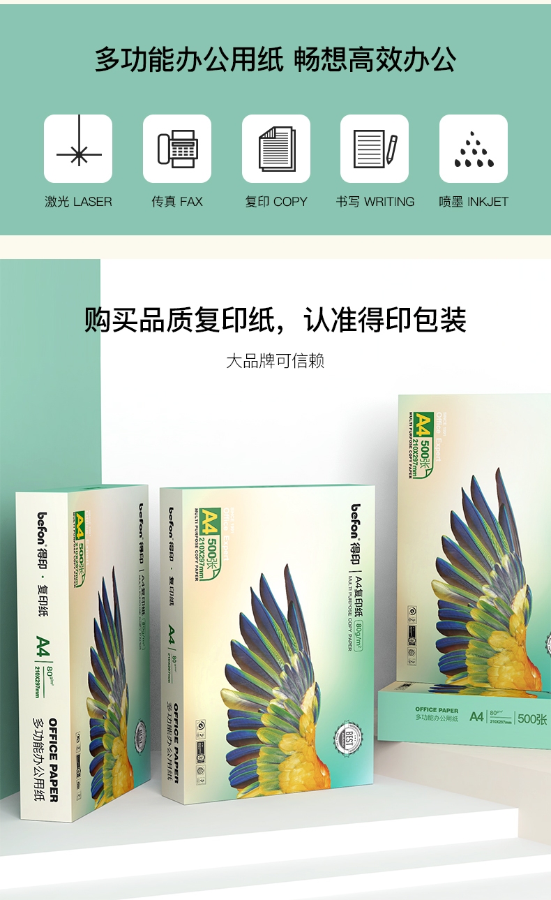 得印(befon)A4复印纸80g 500张/包 8包/箱 多功能办公用纸 整箱4000张 80克A4复印纸打印纸 白色