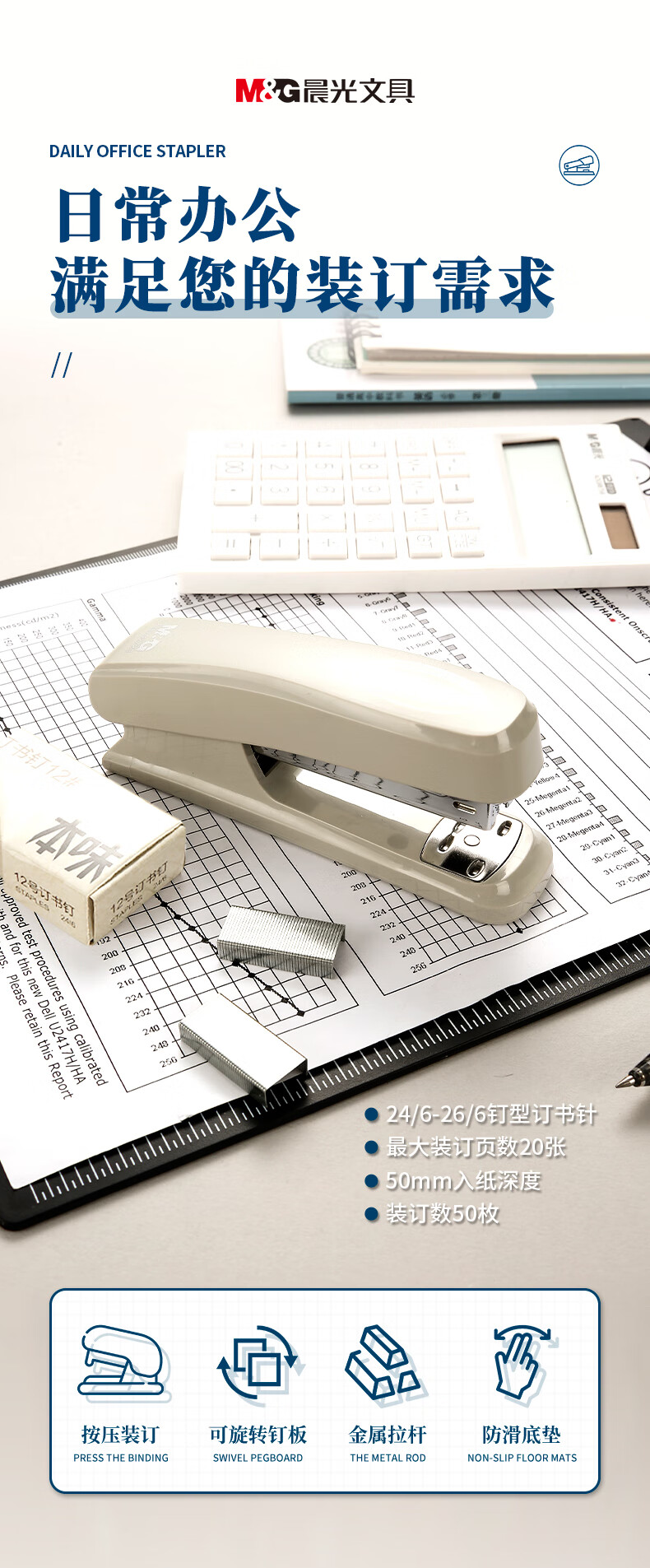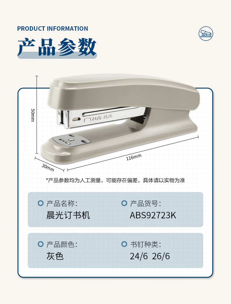 晨光(M&G)文具12#订书机 耐用便携订书器 办公用品 单个装 2个起订 ABS92723 浅灰色