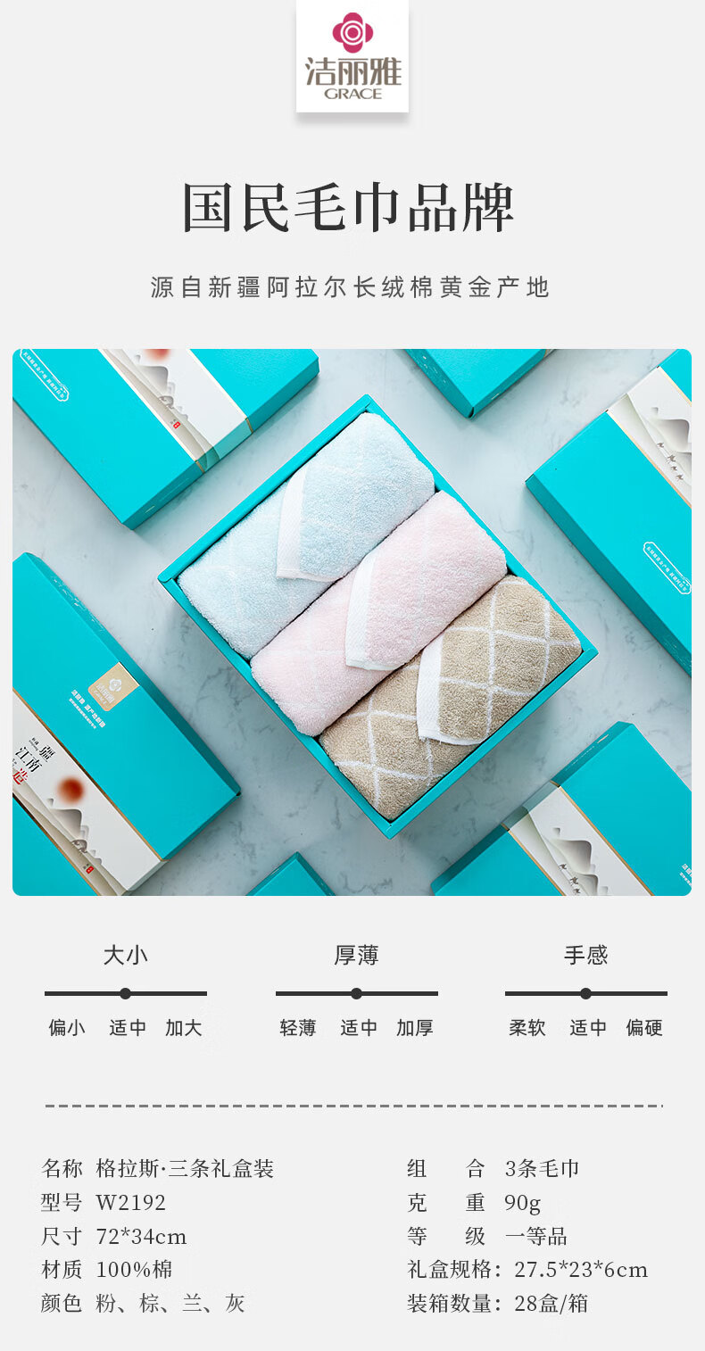 洁丽雅(Grace) 格拉斯面巾 W2192 72*34cm *90g*3 混色(单位:盒)