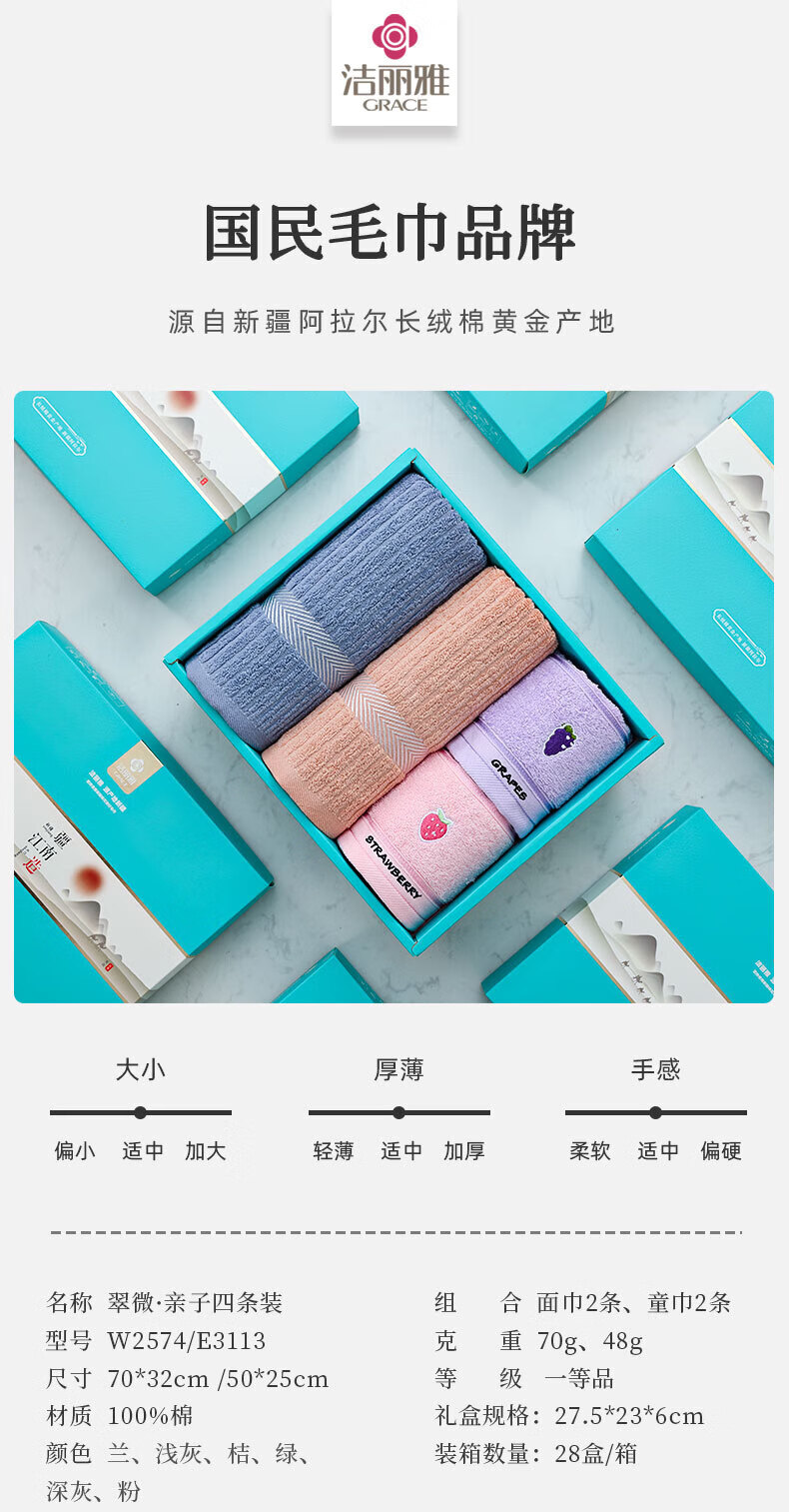 洁丽雅(Grace) 翠微亲子毛巾四条装 W2574+E3113 面巾*2+方巾*2 混色(单位:盒)