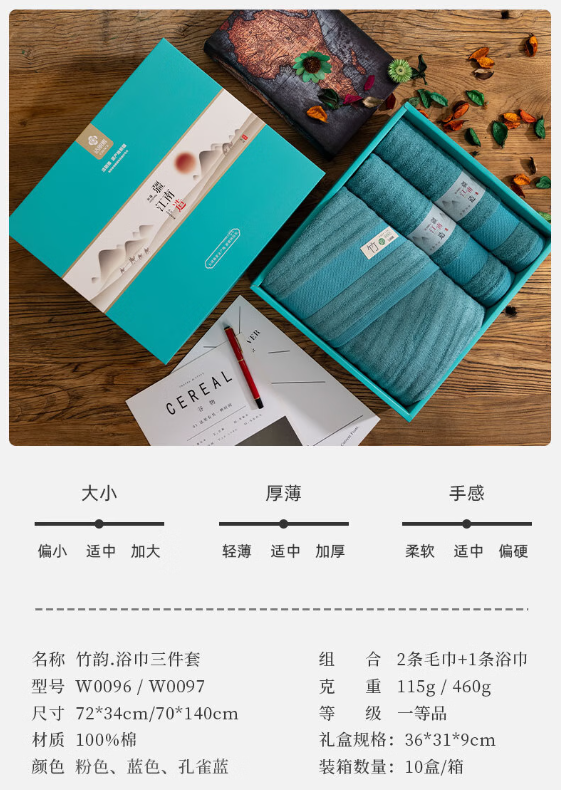 洁丽雅(Grace) 竹韵纯棉毛巾三件套 W0096 + W0097 面巾*2浴巾*1 混色(单位:盒)