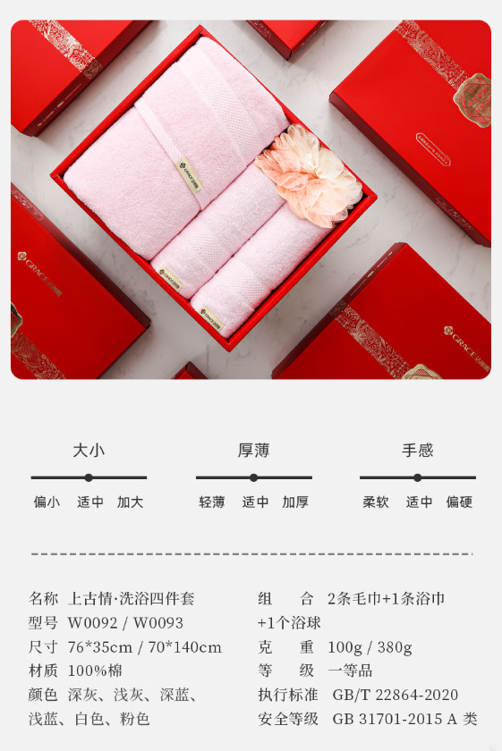 洁丽雅(Grace) 上古情.洗浴四件套 W0092+W0093 70*35cm*100g*2+70*140cm+380g*1 混色(单位:盒)