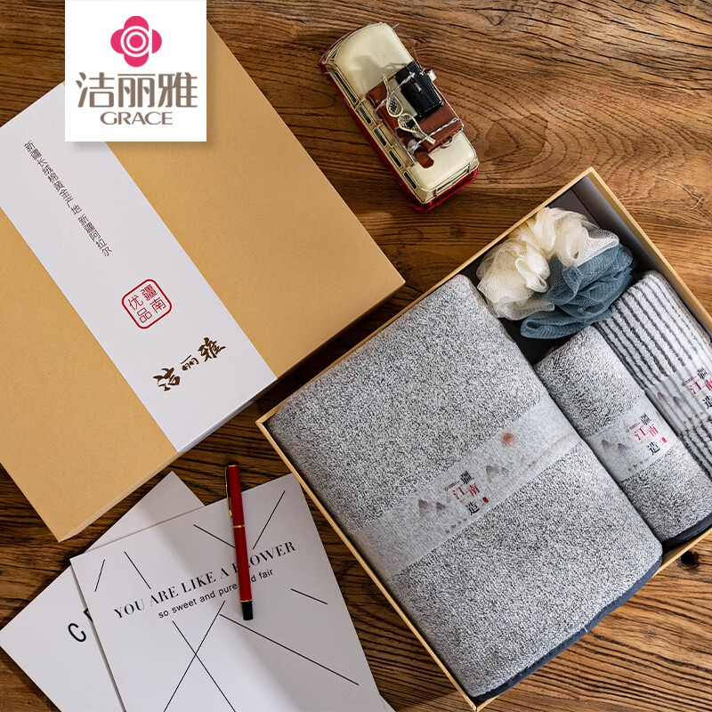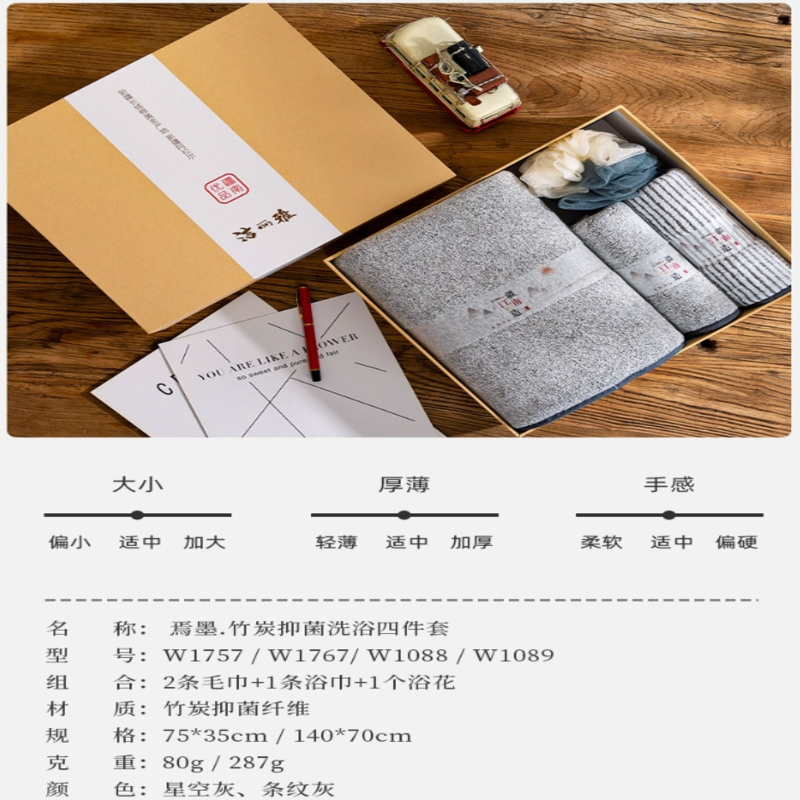 洁丽雅(Grace) 焉墨.竹炭抑菌毛巾洗浴套装 W1757+W1767+W1088+W1089 毛巾*2+浴巾*1+浴球*1 混色(单位:盒)