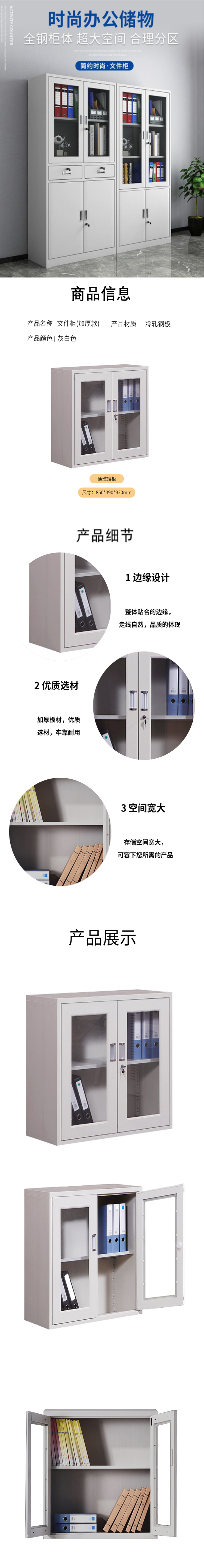 企诺 办公文件柜档案柜矮柜通玻矮柜 QNGa17A1-05PA 850*390*920mm|0.5mm 灰白色(单位:个)