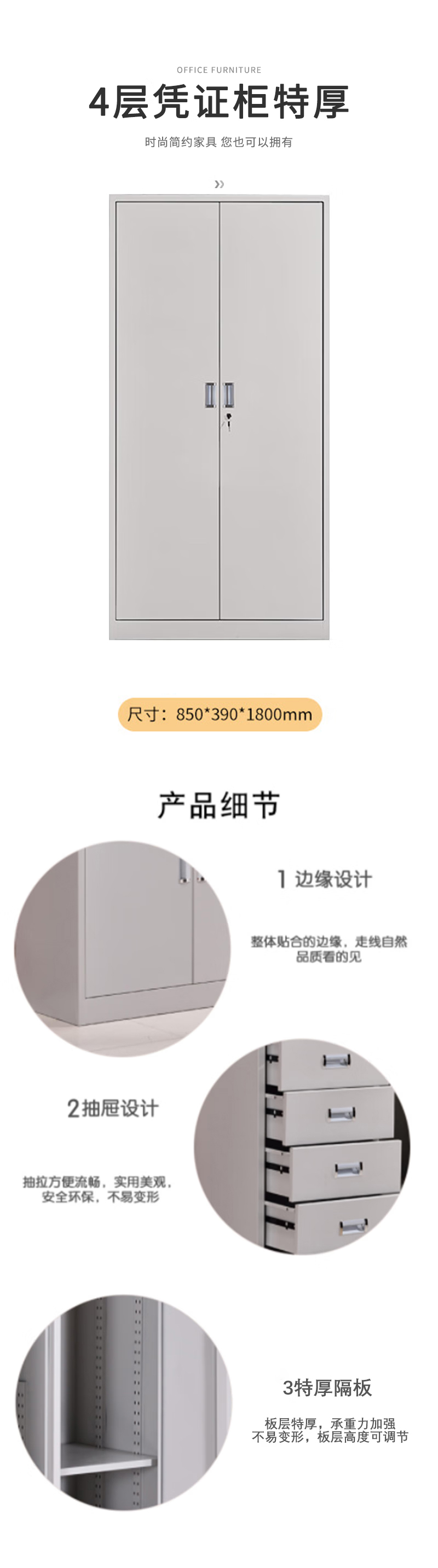 企诺 办公文件柜特厚通门4层凭证柜 QNGa05A1-08PA 850*390*1800mm 灰白色(单位:个)