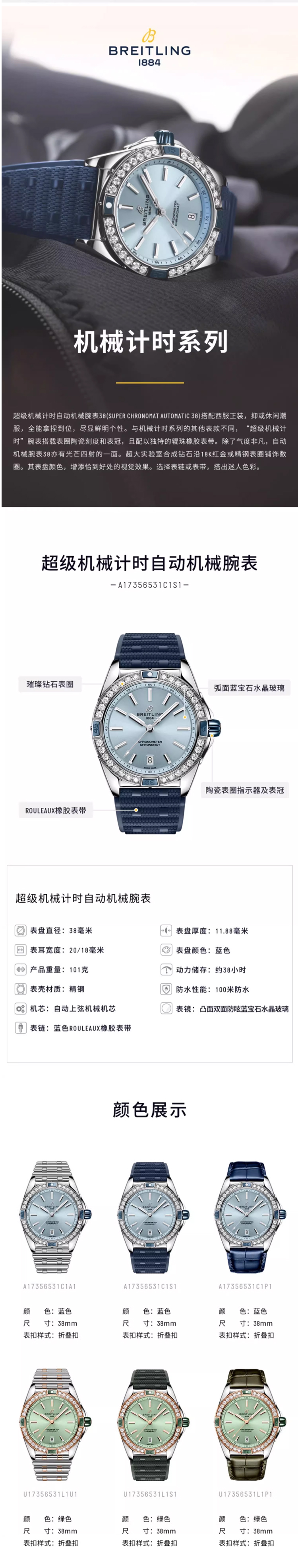 百年灵(BREITLING)超级机械计时系列38机械女表 A17356531C1A1(单位:块) 天蓝色