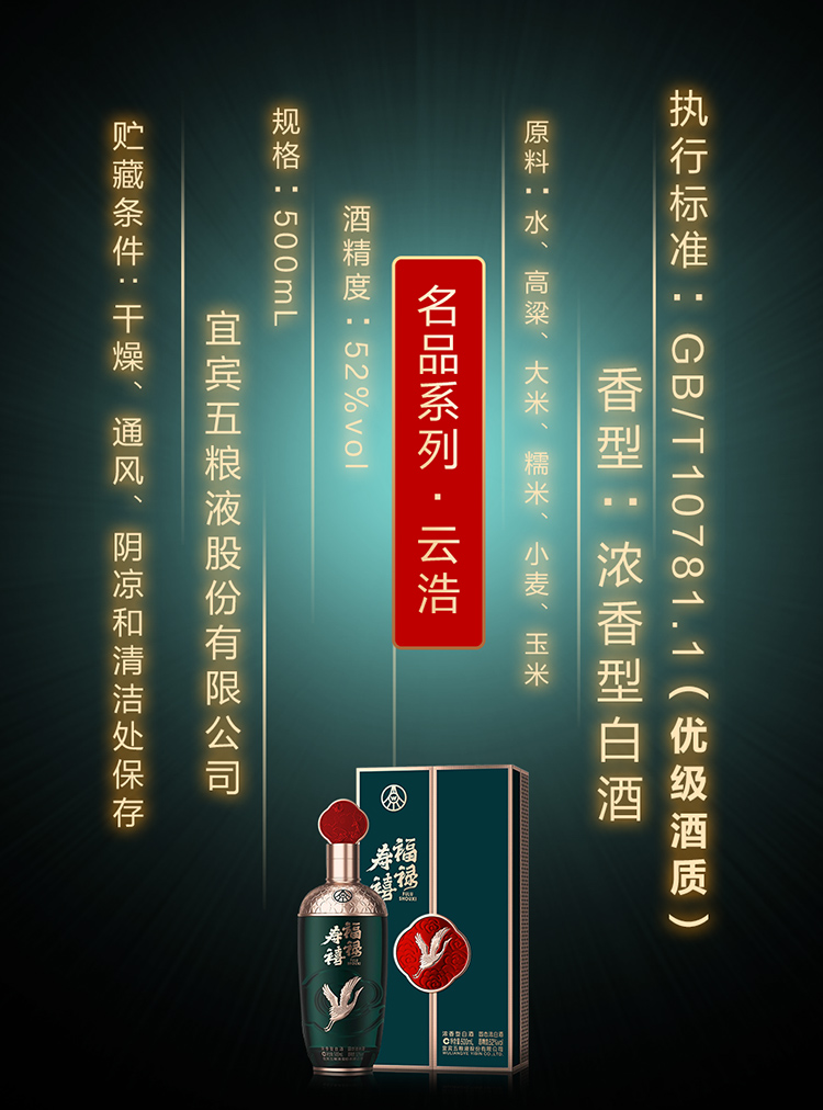 五粮液 股份 福禄寿禧云浩浓香型52度 白酒 500ml*2瓶/组 苍翠色(单位:组)